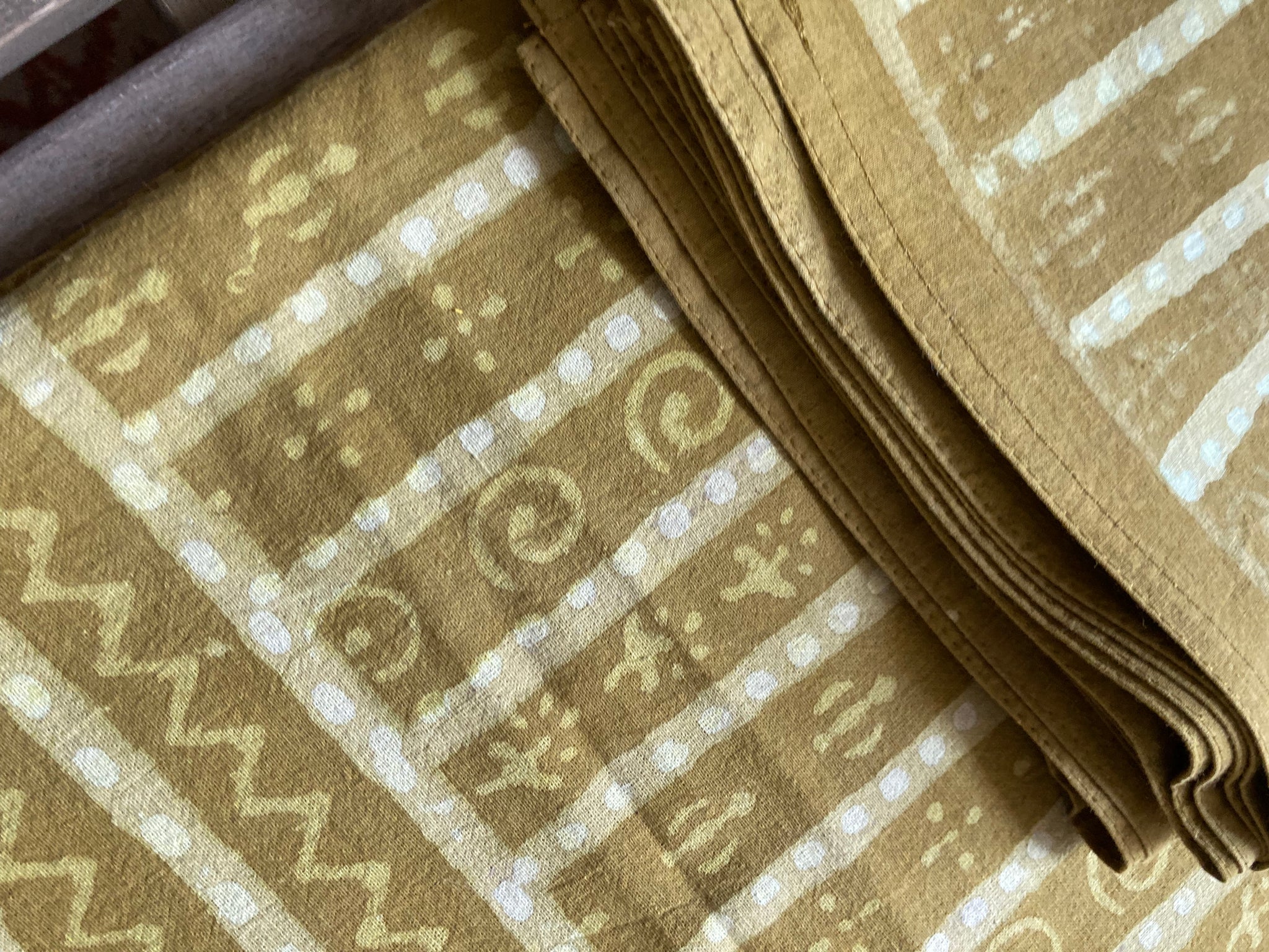 Gorgeous Dabu table cloth. 100% cotton. This table cloth is handmade, dye resist style of using mud or wax batik - hand stamped and hand dyed by small collectives. These pieces are all unique and One-Of-A-Kind. Imperfections are to be anticipated with all natural fibre and hand worked items.