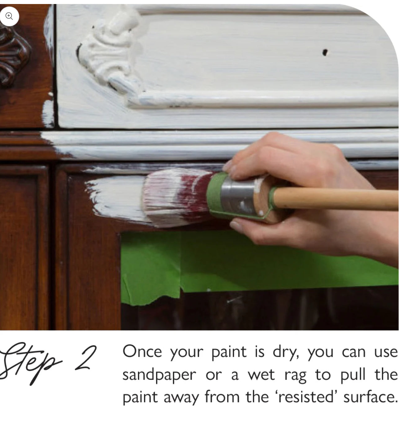 Anything that is applied on top of the waxed areas will easily distress without too much pressure from sanding! You will notice this resistance once you are giving your piece a light sanding at the end of your application of all layers of paint. Any paint underneath the wax will remain in place, and any paint applied on top of the wax will come off effortlessly, allowing for the perfect distressed look.