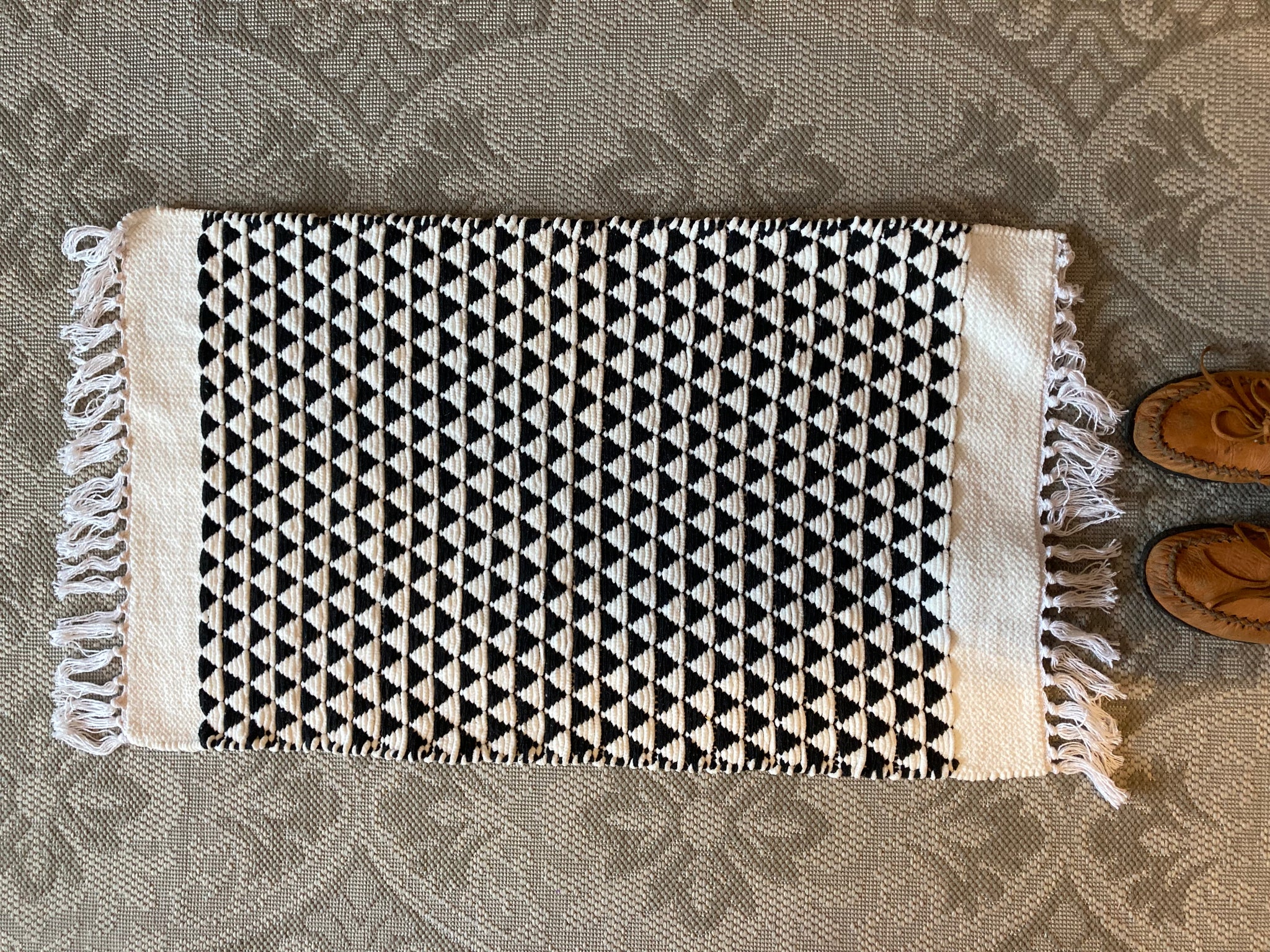 Beautiful hand loomed chenille rug in a gorgeous black and cream diamond pattern. Makes the perfect scattered rug.