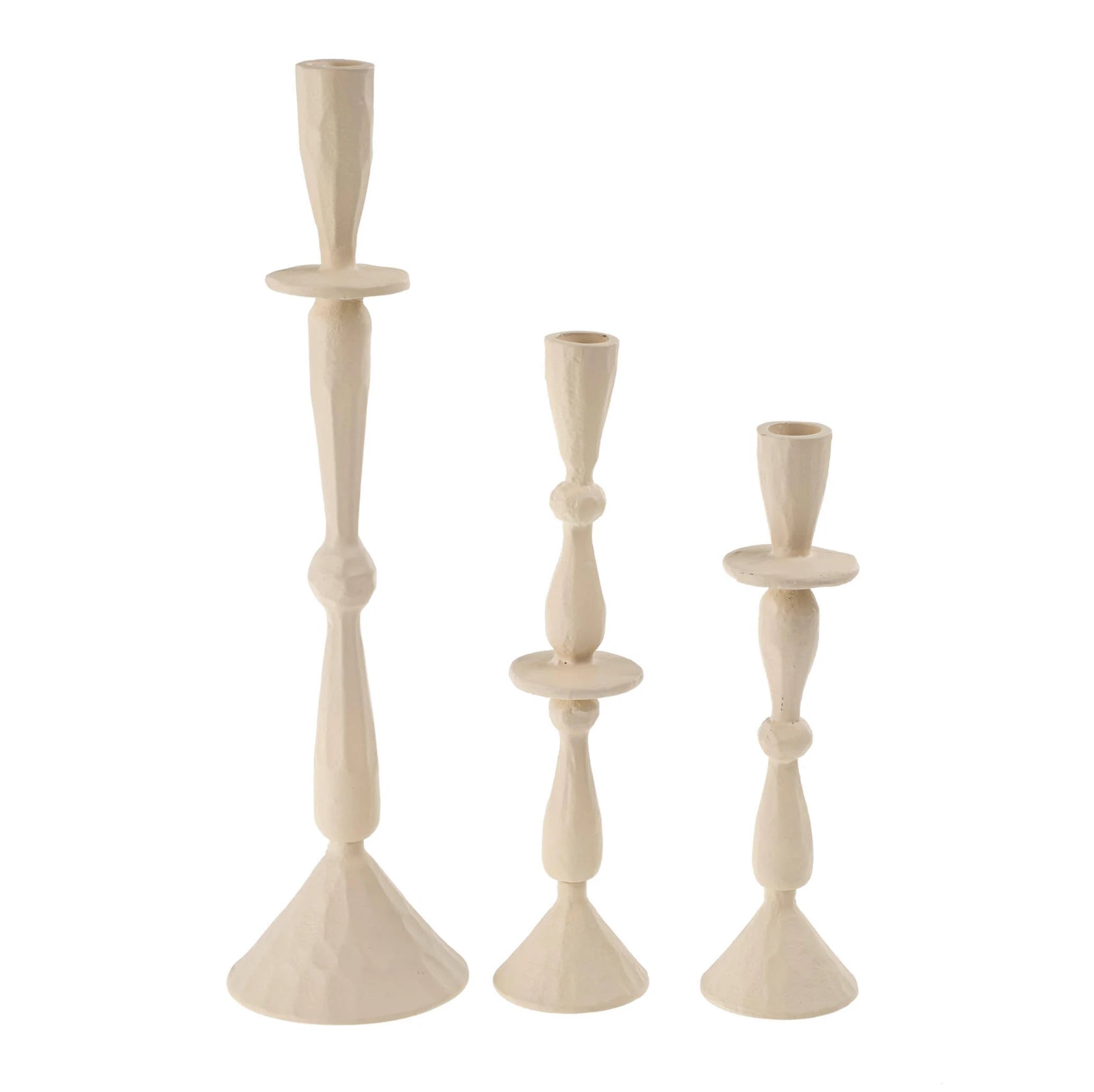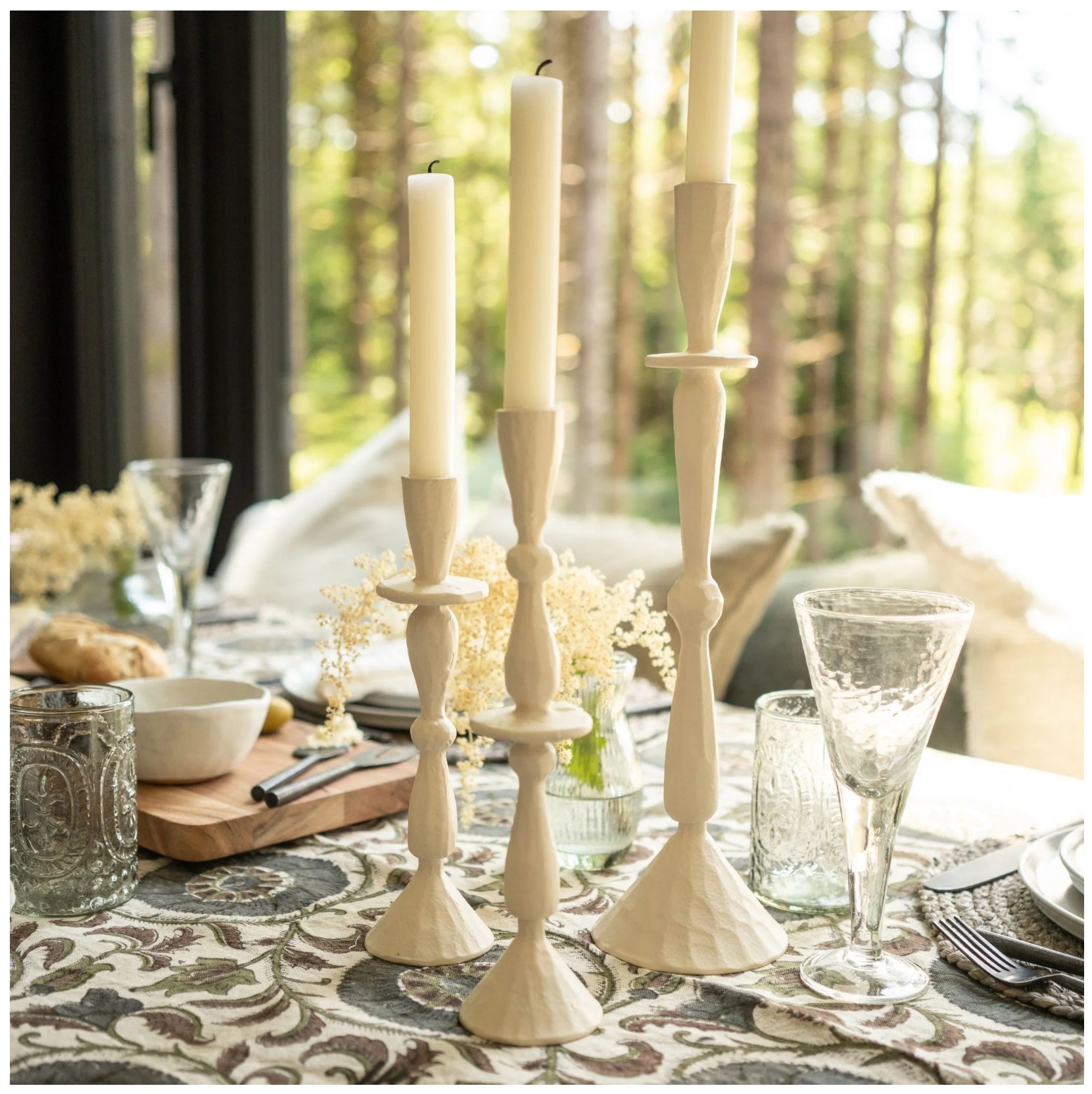 Elevate your tablescape with the hand forged aluminum Imani Candle Holder, handmade in Moradabad, a city in India celebrated for its metal craftsmanship. The creamy neutral powder coating seamlessly combines contemporary flair with traditional manufacturing techniques, resulting in a stunning matte finish that exudes dramatic character. Add a sense of romance and occasion to everyday evenings by lighting candles at dinnertime, or by curating a vignette with a mix of sizes on a side console.