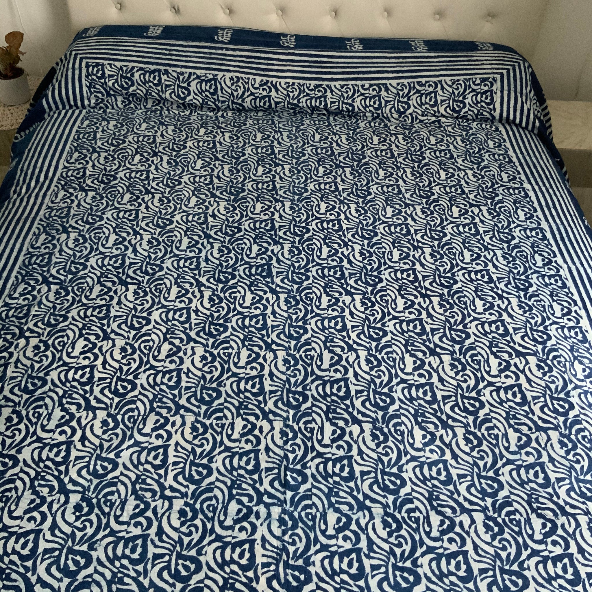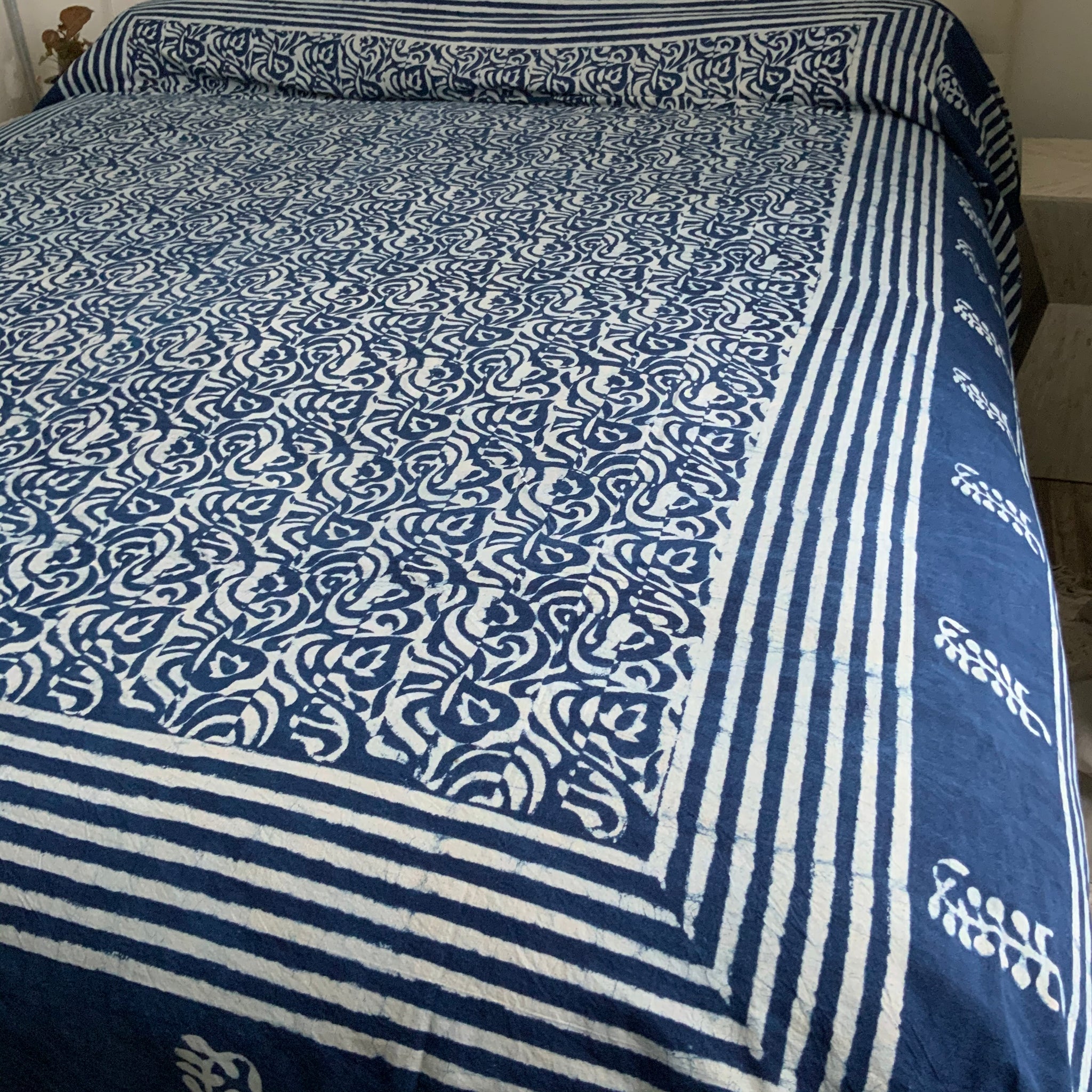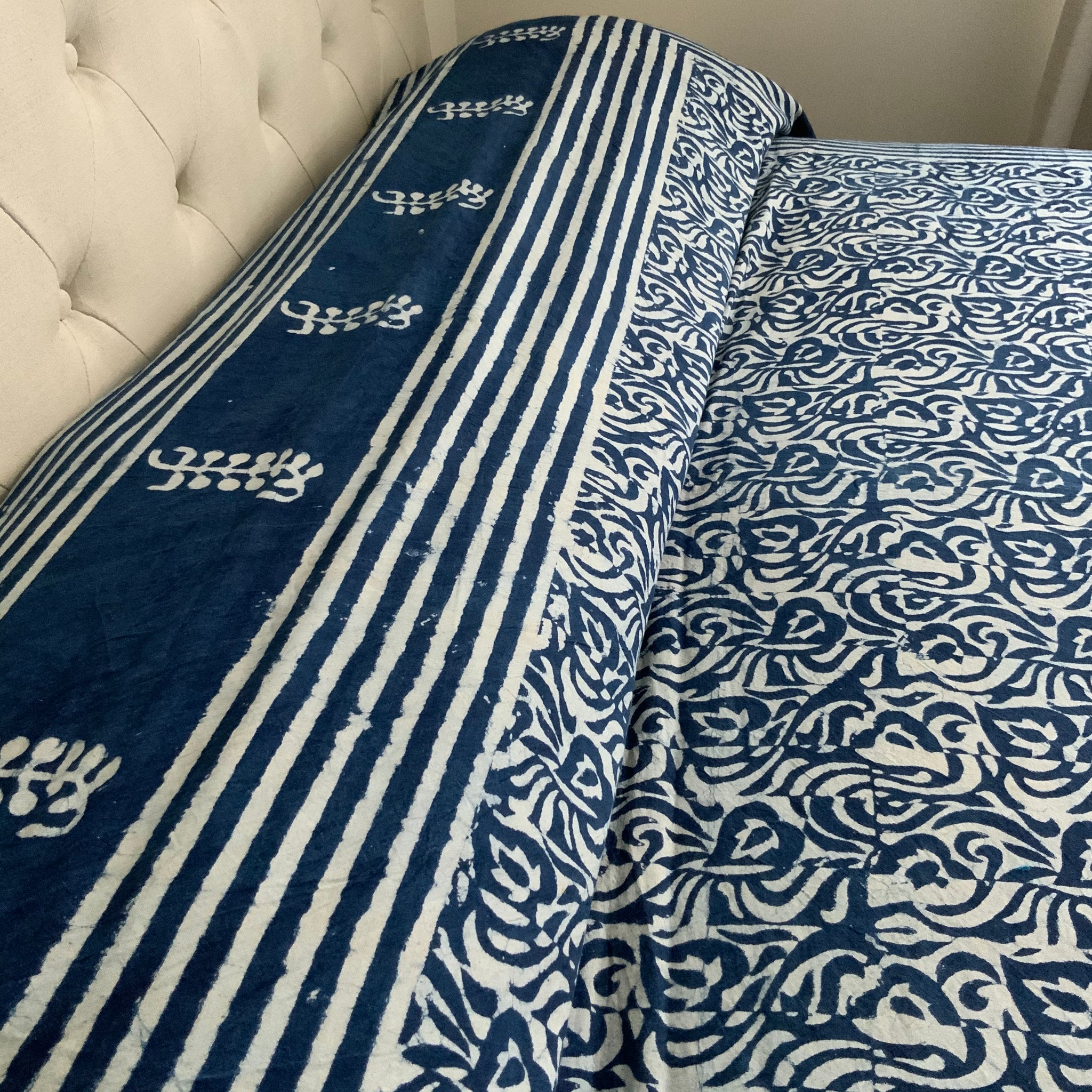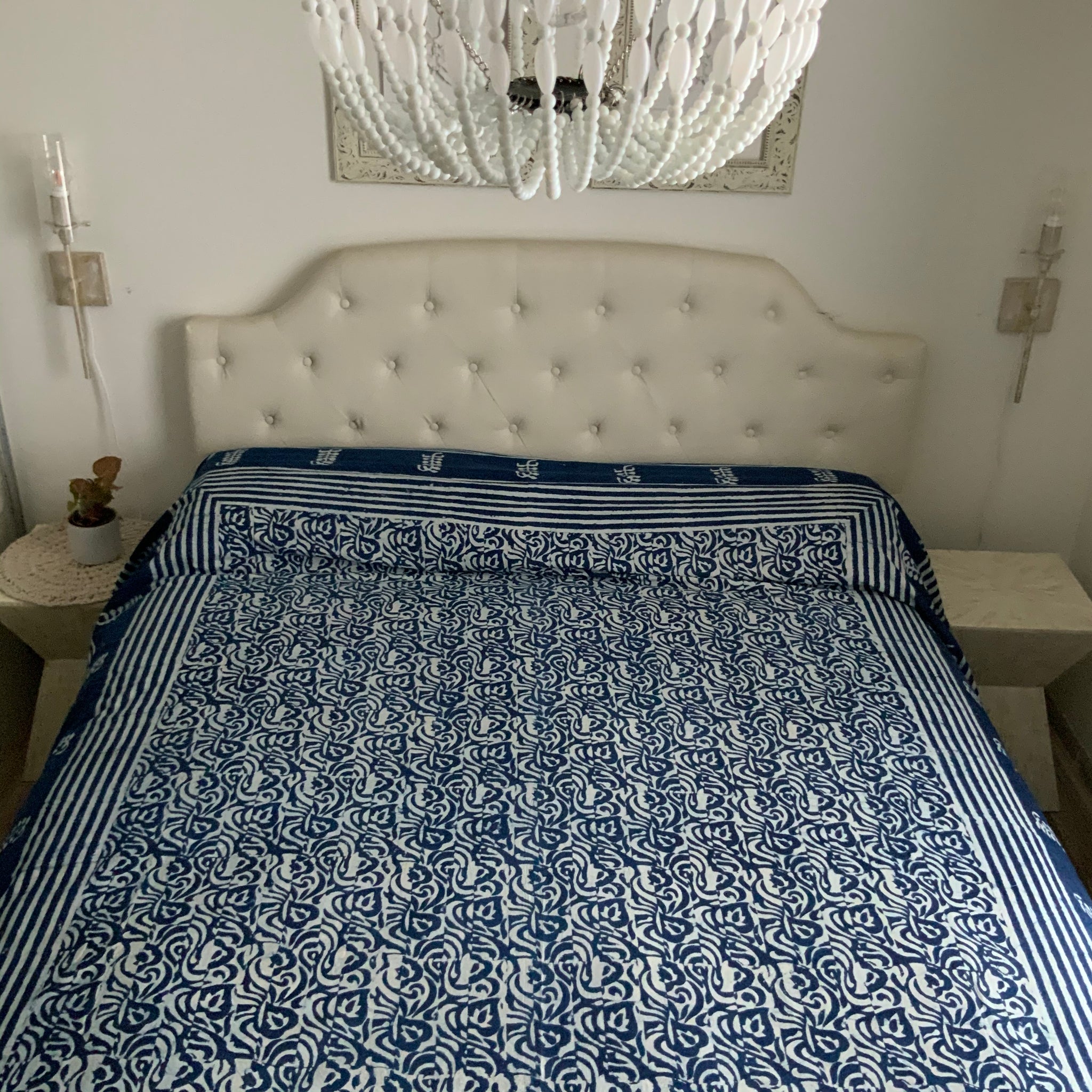 These stunning, on trend block print batik Indigo bed covers are 100% gorgeous Indian cotton and 1000% chic. They can also be used as table cloths, wall hangings, sarongs, picnic blankets and just about anything else that calls for a dash of fab. Hand made and all One-Of-A-Kind. Imperfections should be anticipated with natural fibres and hand-worked goods.