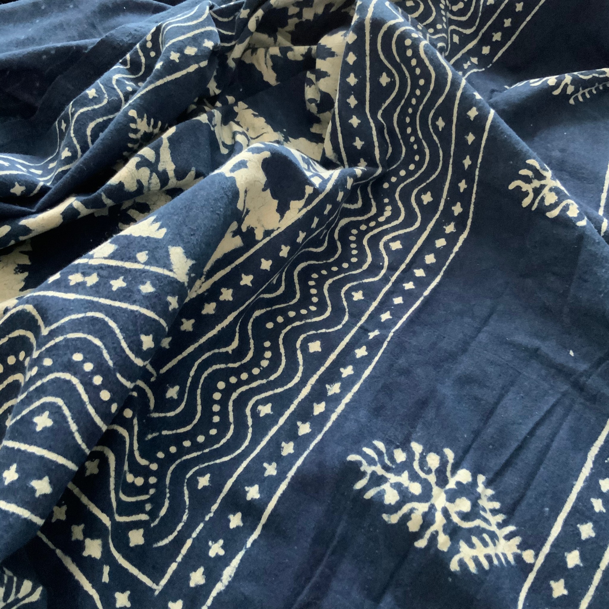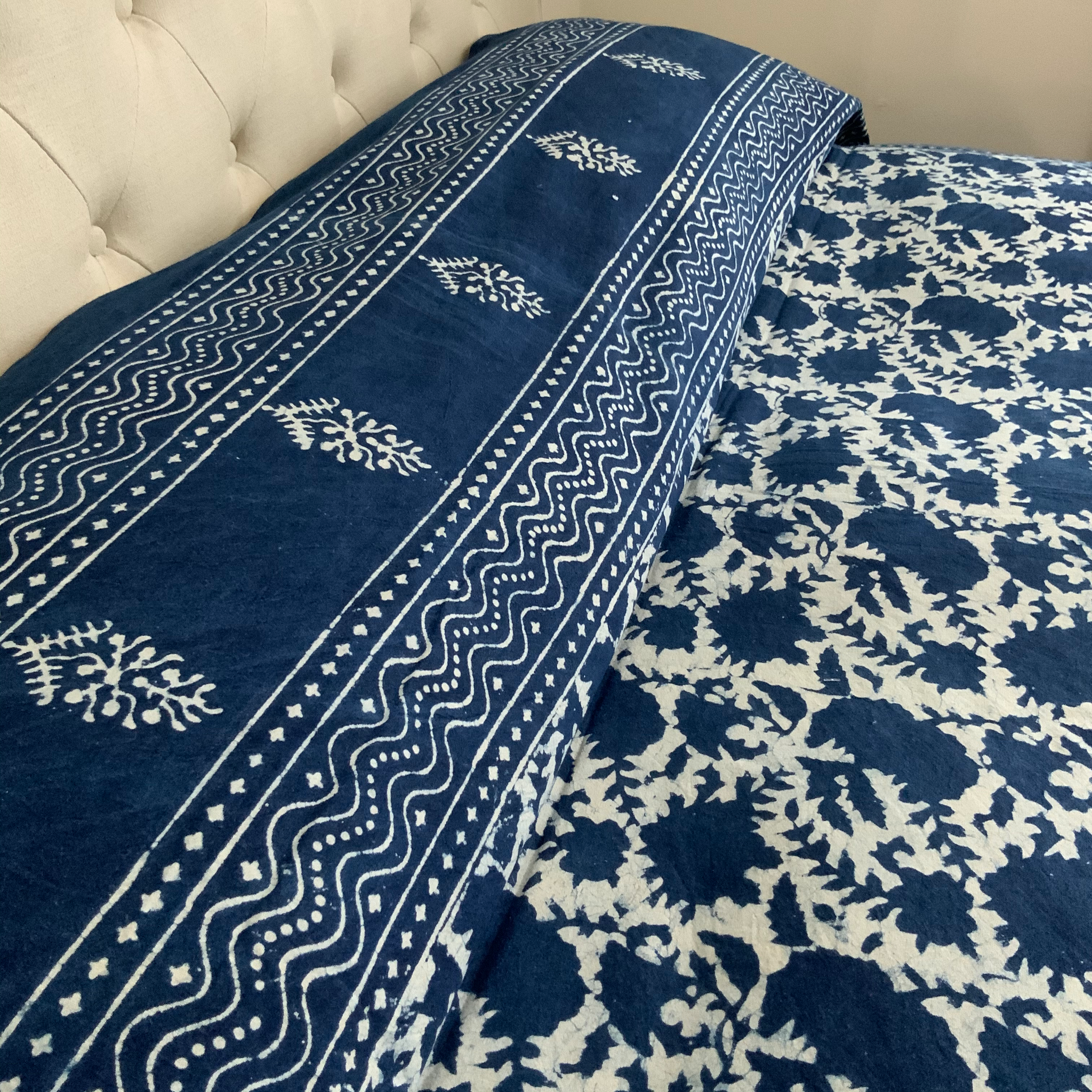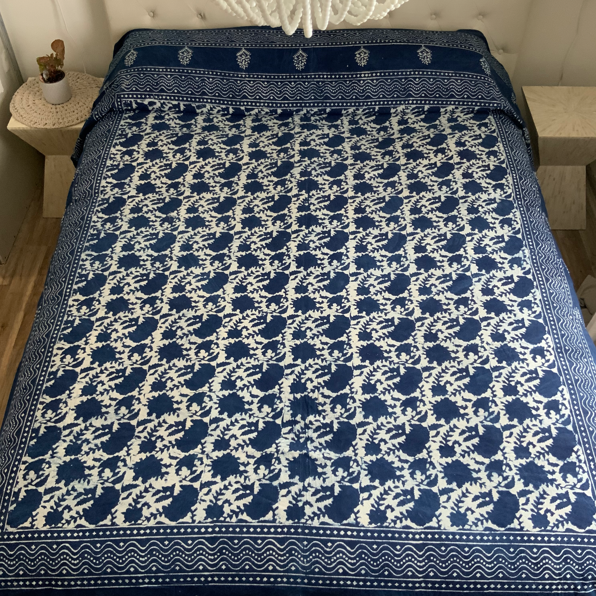 These stunning, on trend block print batik Indigo bed covers are 100% gorgeous Indian cotton and 1000% chic. They can also be used as table cloths, wall hangings, sarongs, picnic blankets and just about anything else that calls for a dash of fab. Hand made and all One-Of-A-Kind. Imperfections should be anticipated with natural fibres and hand-worked goods.