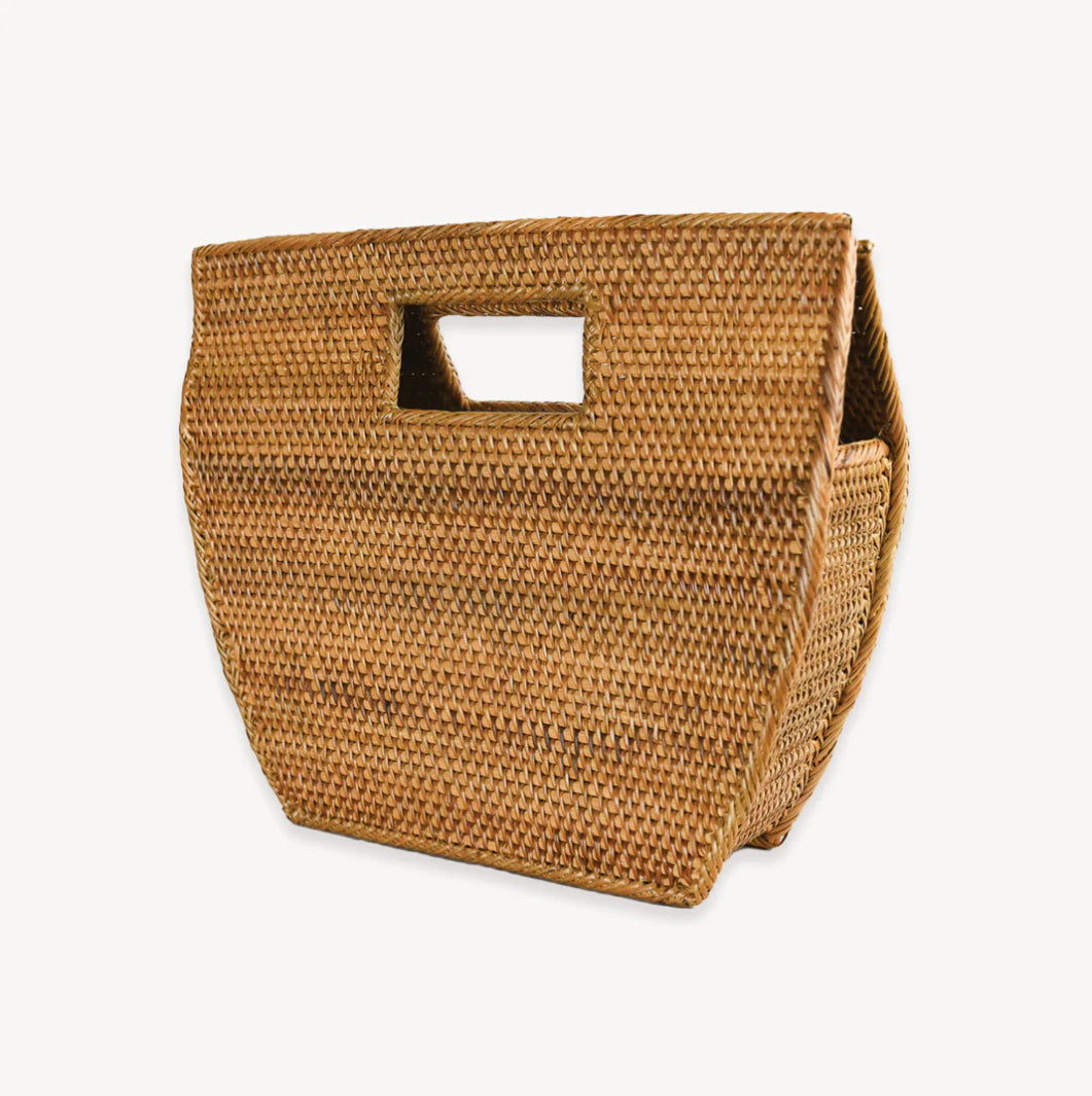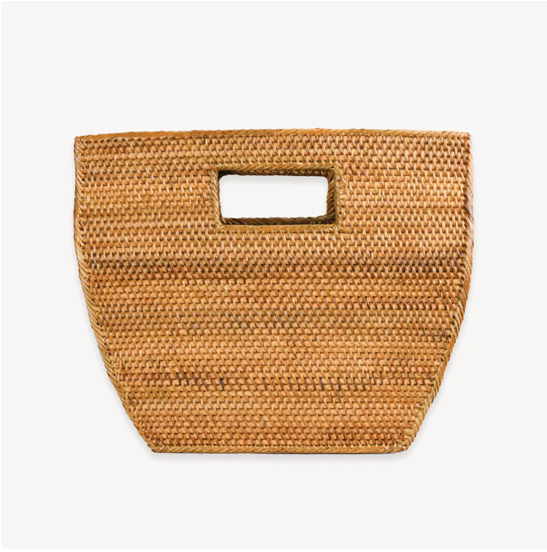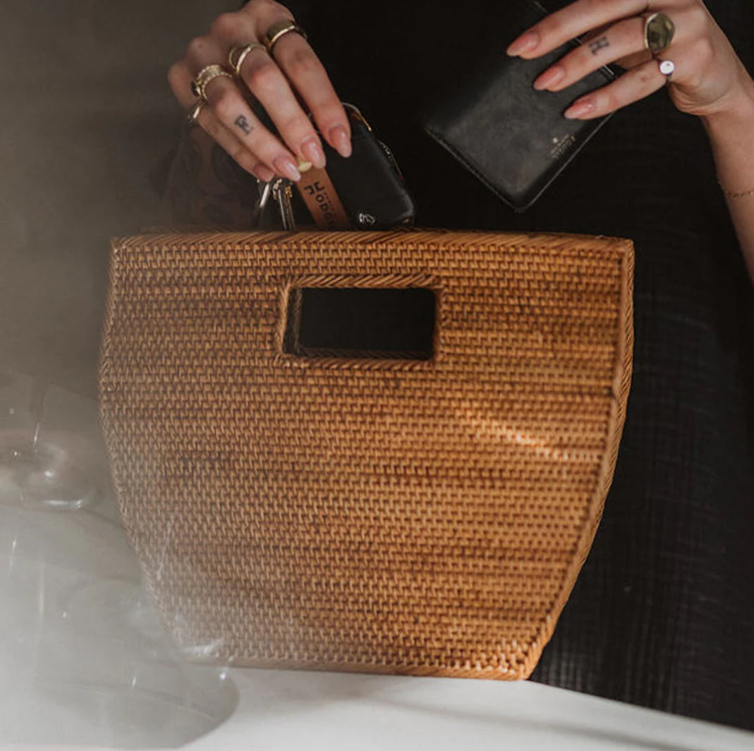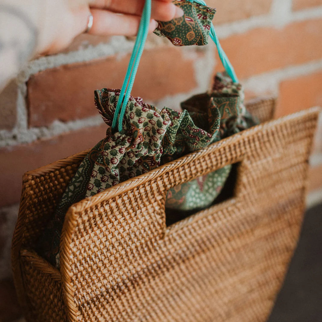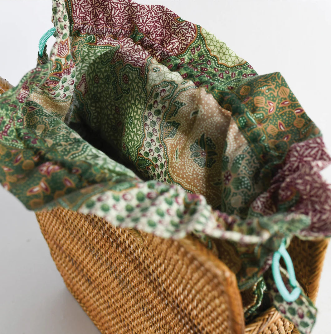 Hand-woven by independent Balinese artisans in a fair-trade environment, each bag is crafted using sustainably-harvested rattan, vegan leather, and an up-cycled fabric lining.
