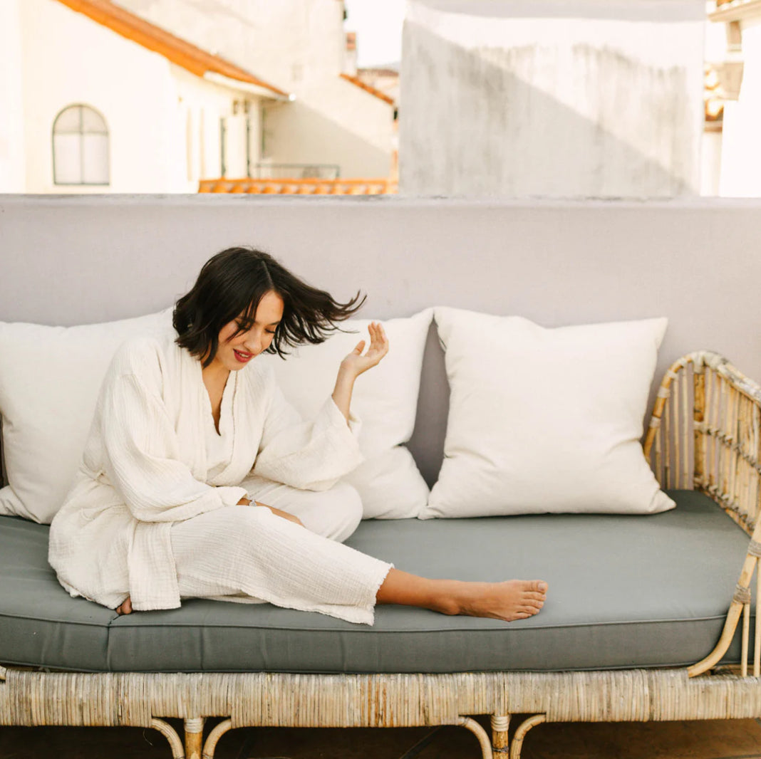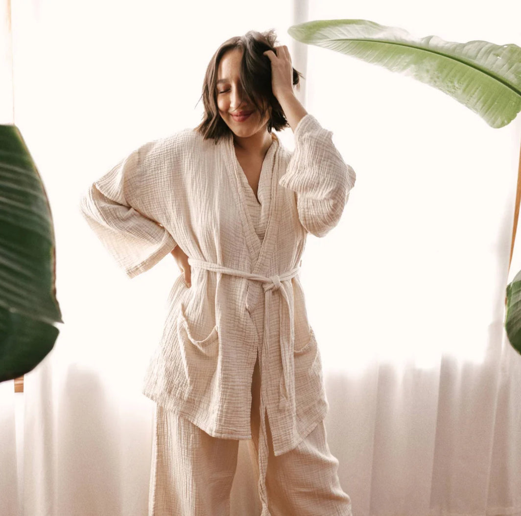 The Crinkle Cardigan pairs with the Palazzo Pants and Crinkle Crop Top in a 3-piece lounge suit that has an effortless, free, beautiful look. Wear individually or collectively. Compact and versatile - great for travel and ideal for your capsule wardrobe. Note that these pieces are made from natural materials, and may vary in shade from piece to piece.