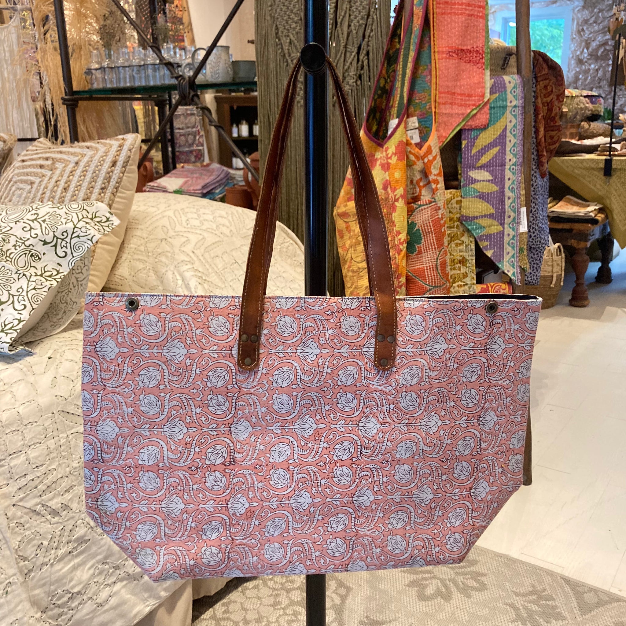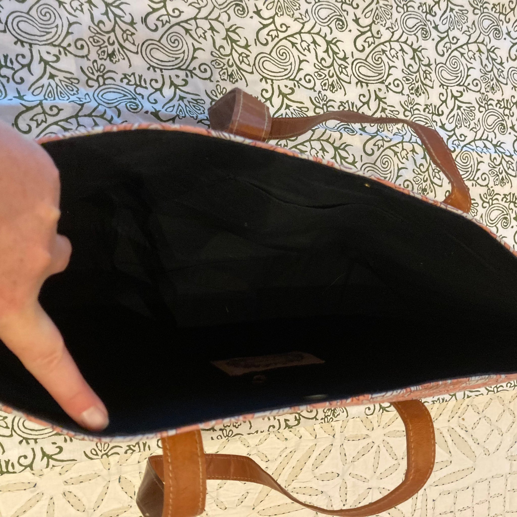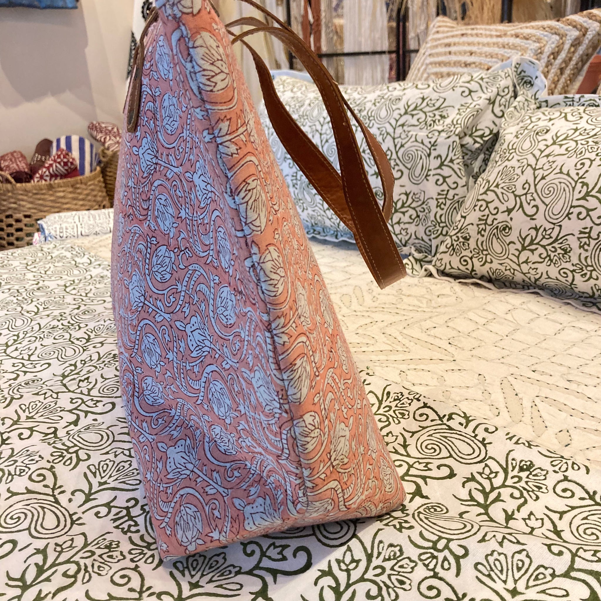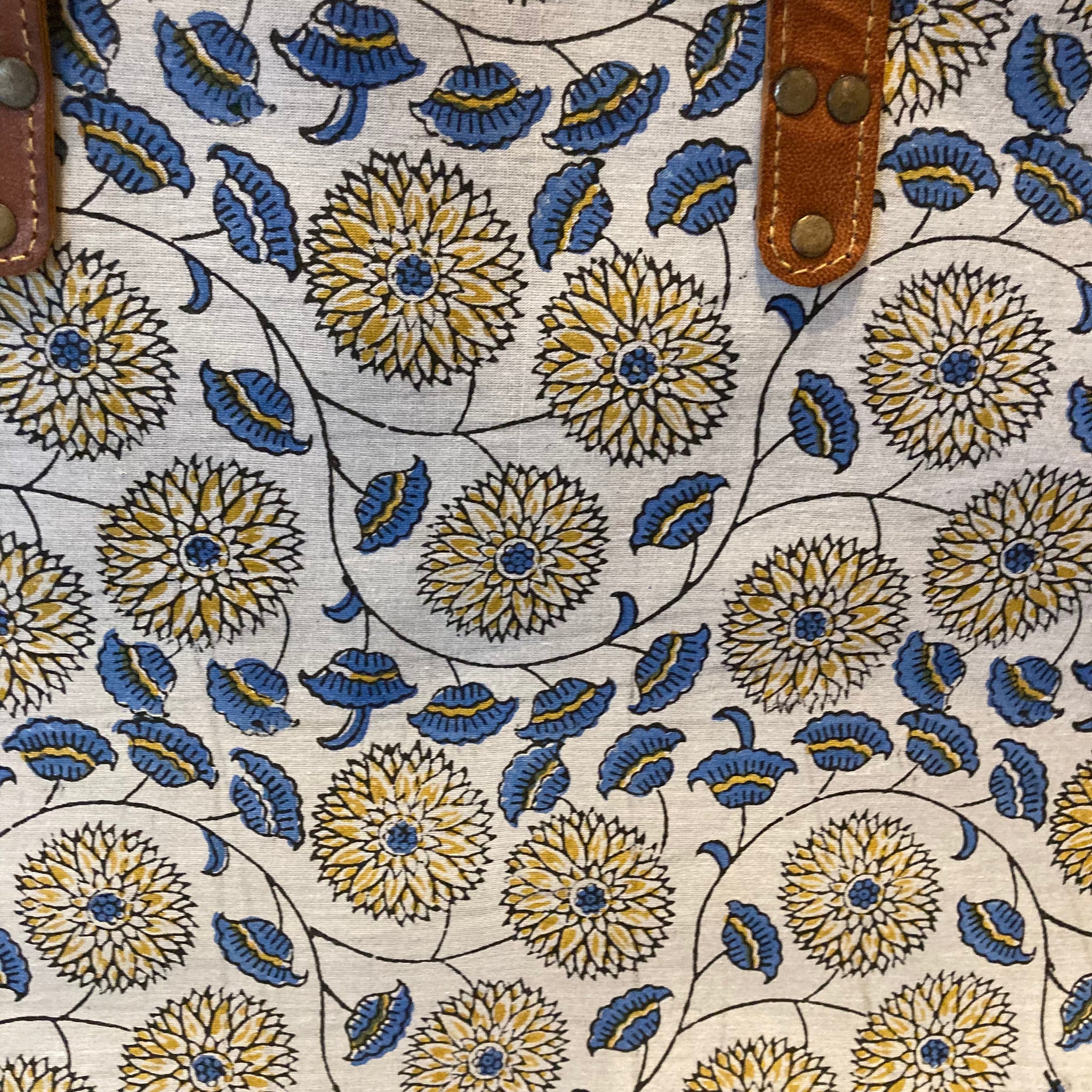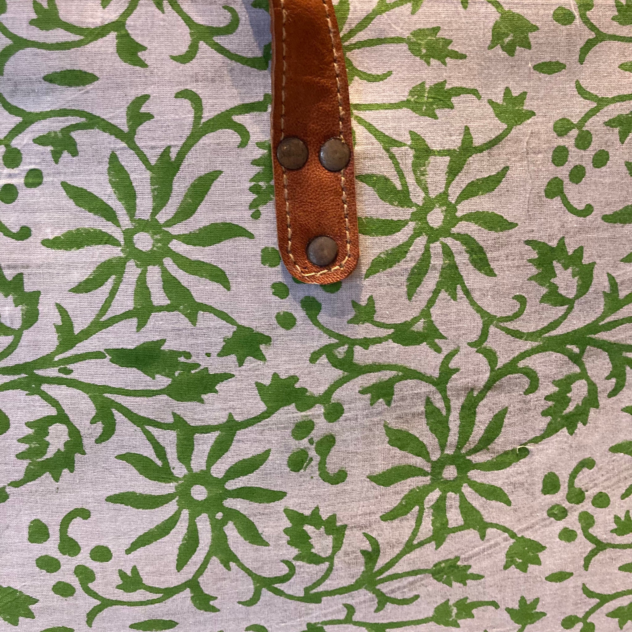 Beautiful blockprint bags made of upcycled materials. Leather strap in Black and Brown. Cotton lining, inside zippered pocket and gusetted bottom.